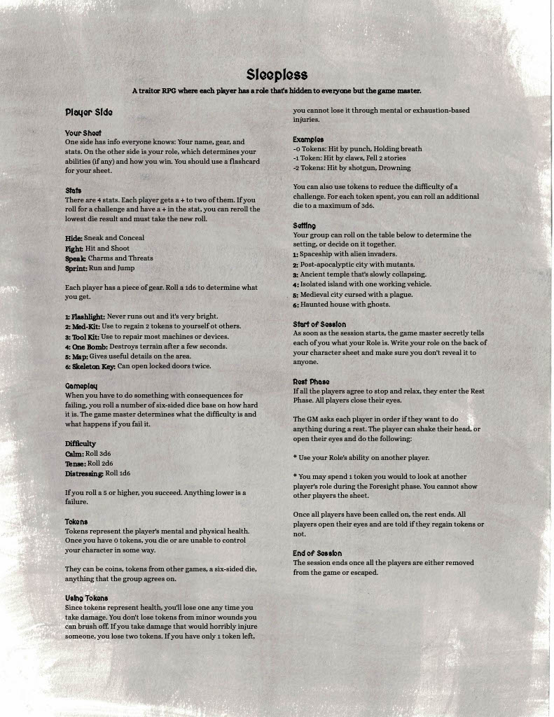 A hidden role RPG where everyone has their own goal. They are all trapped somewhere, from a haunted house to a ruined spaceship. The Bystanders want to escape and assume everyone else wants to, but some people are not what they seem.